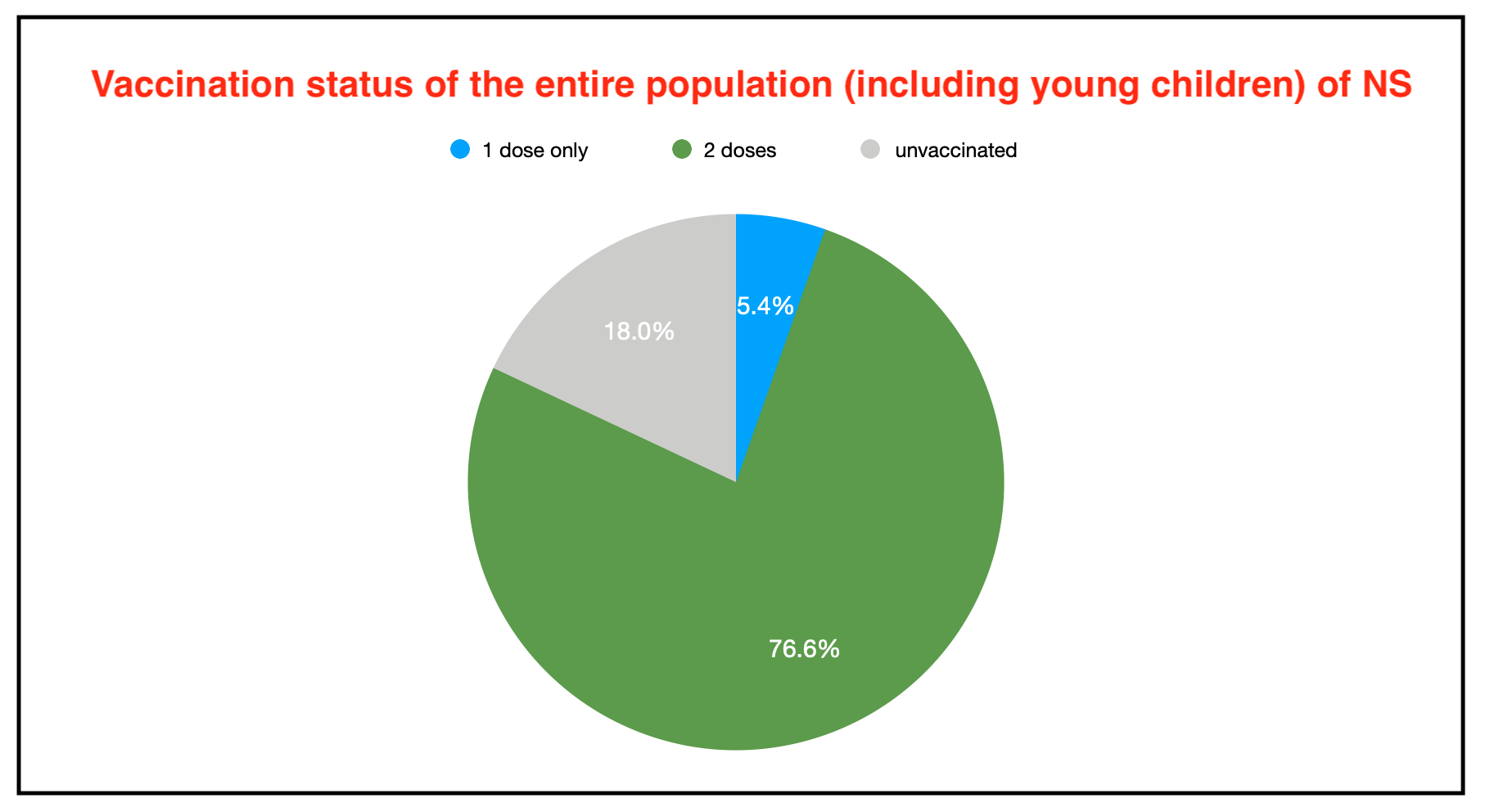 By end of day yesterday, 82.0% of the entire population (including young children) have received at least one dose of vaccine, and 76.6% have received two doses.