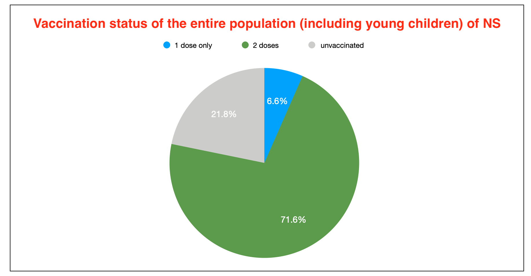 However, the approximately 8,000 military personnel stationed in Nova Scotia were vaccinated through the military’s vaccination program and are not included in the above percentages; if they are included, then the double-dosed percentage increases to 72.4% of the entire population.