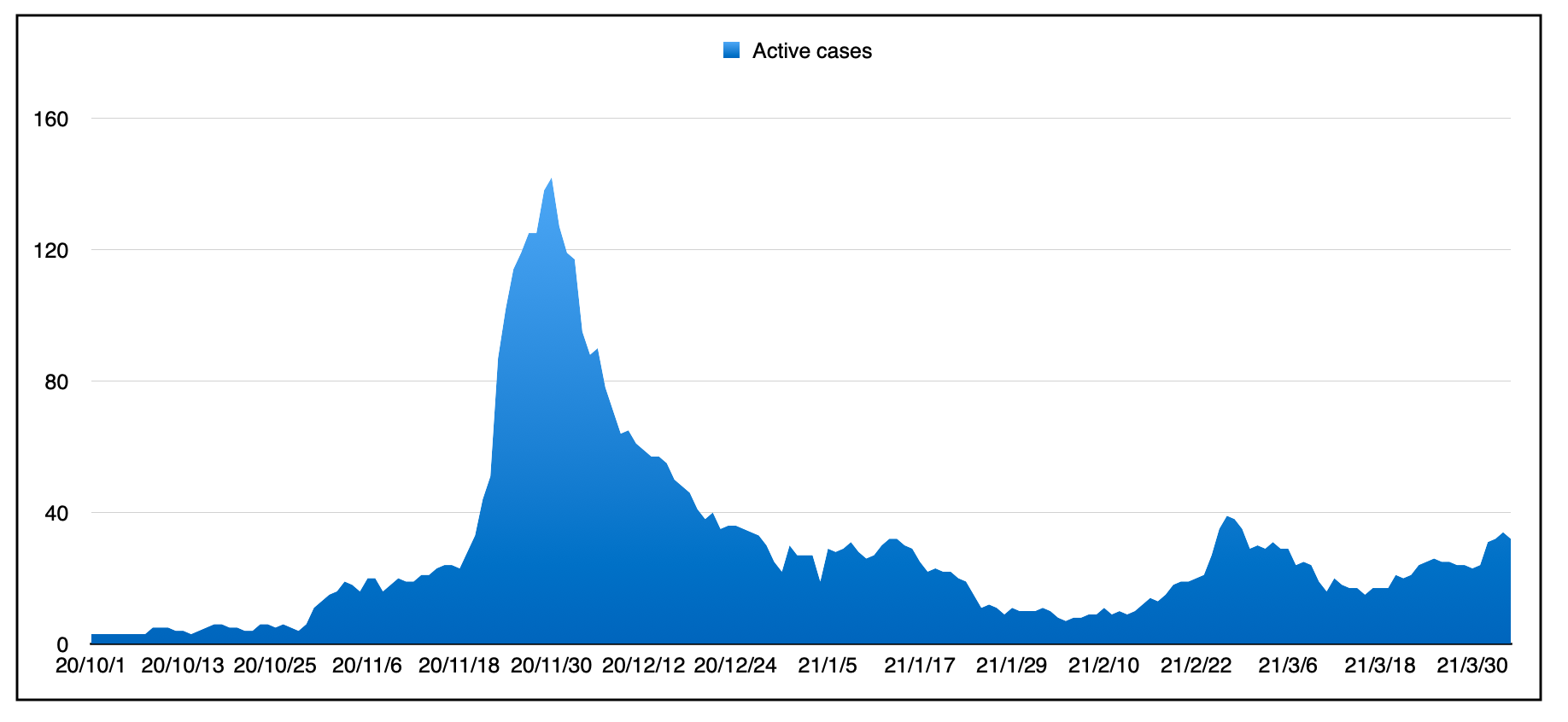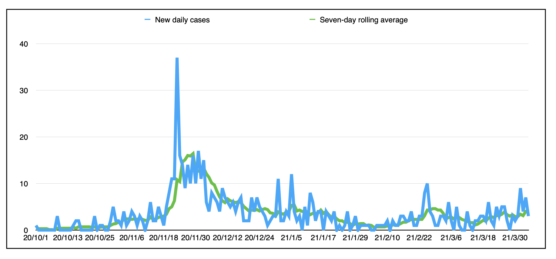 以下是自第二次浪潮(10月1日)开始以来的每日新增病例和7天的滚动平均值(今天为4.4例):