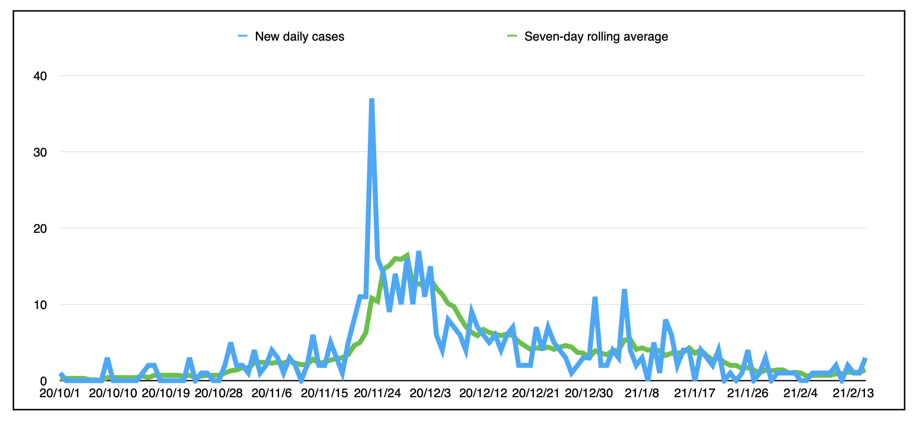 以下是自第二次浪潮(10月1日)开始以来的每日新增病例和7天的滚动平均值(今天为1.4例):