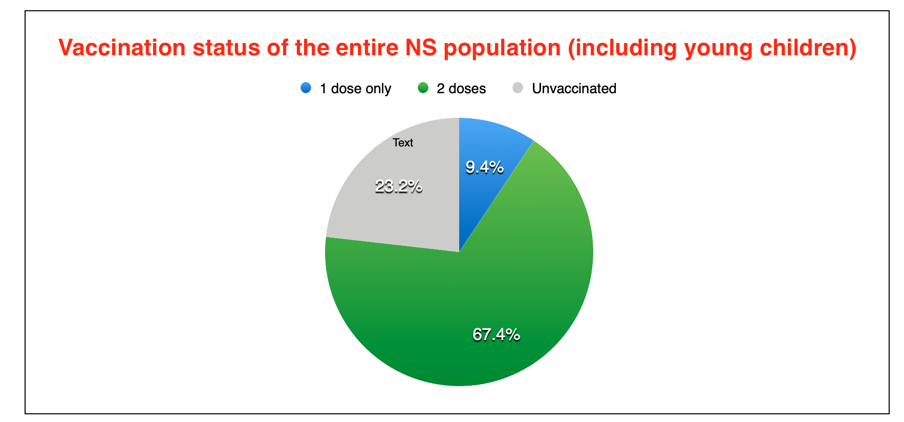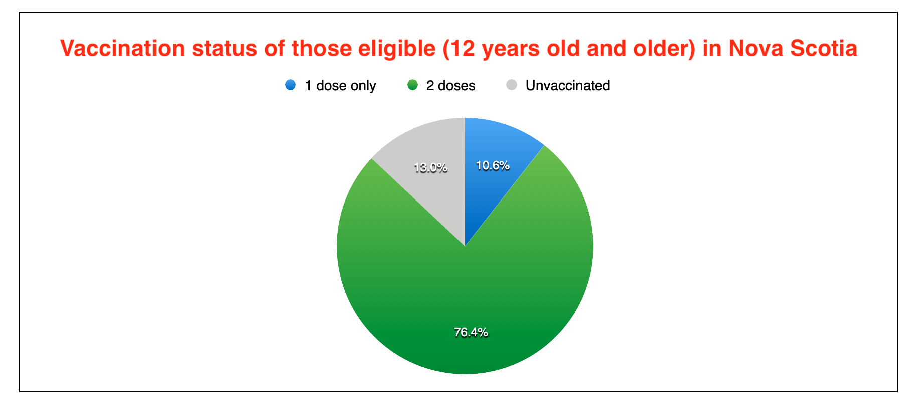 在符合接种条件的人群(12岁及以上)中,87.0%至少接种了一剂疫苗,76.4%接种了两剂疫苗。这是我的粗略估计,用的是我对人口年龄群的最佳估计。