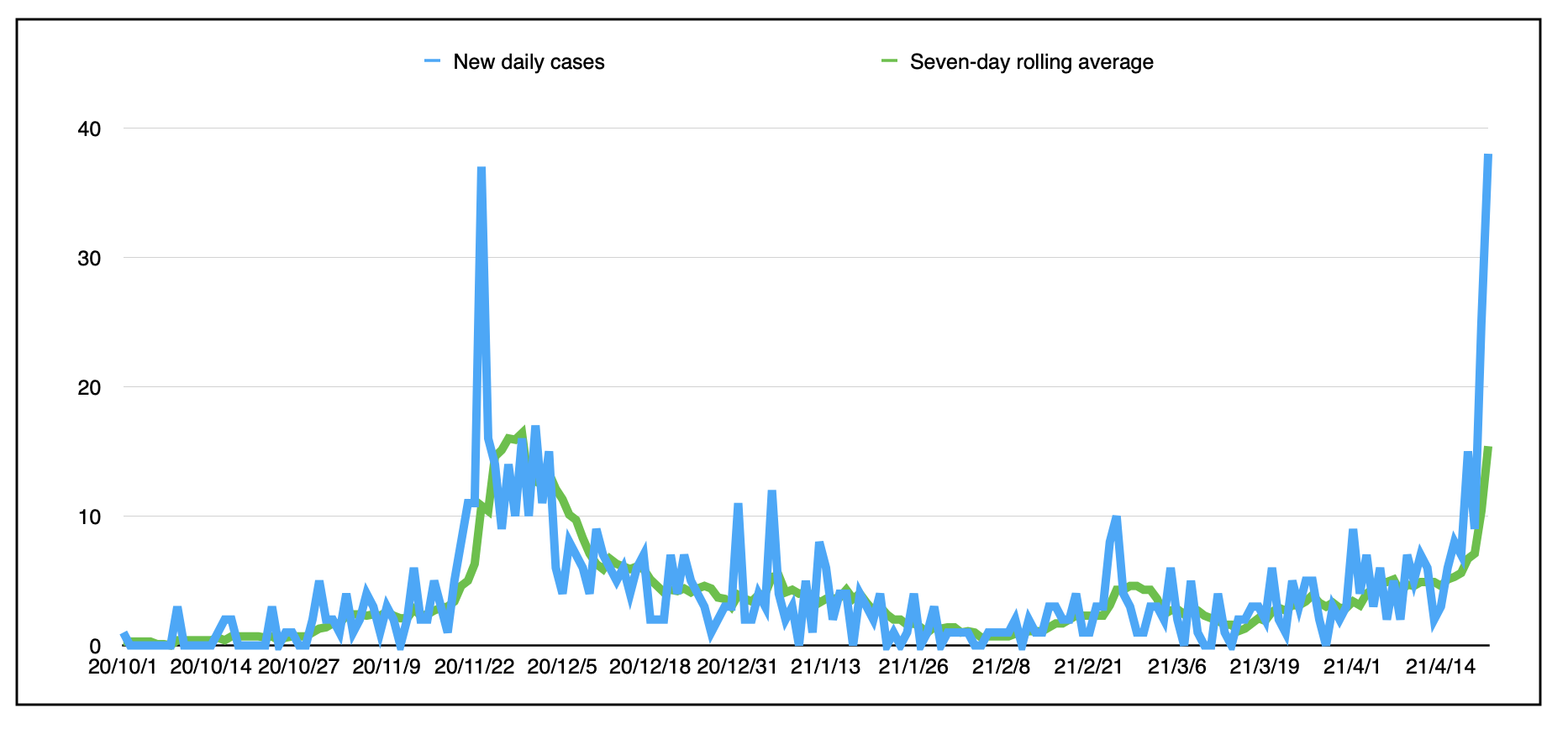 以下是新的每日案例和七天的滚动平均值(今天在10.4)以来,自第二波开始以来(10月1日):