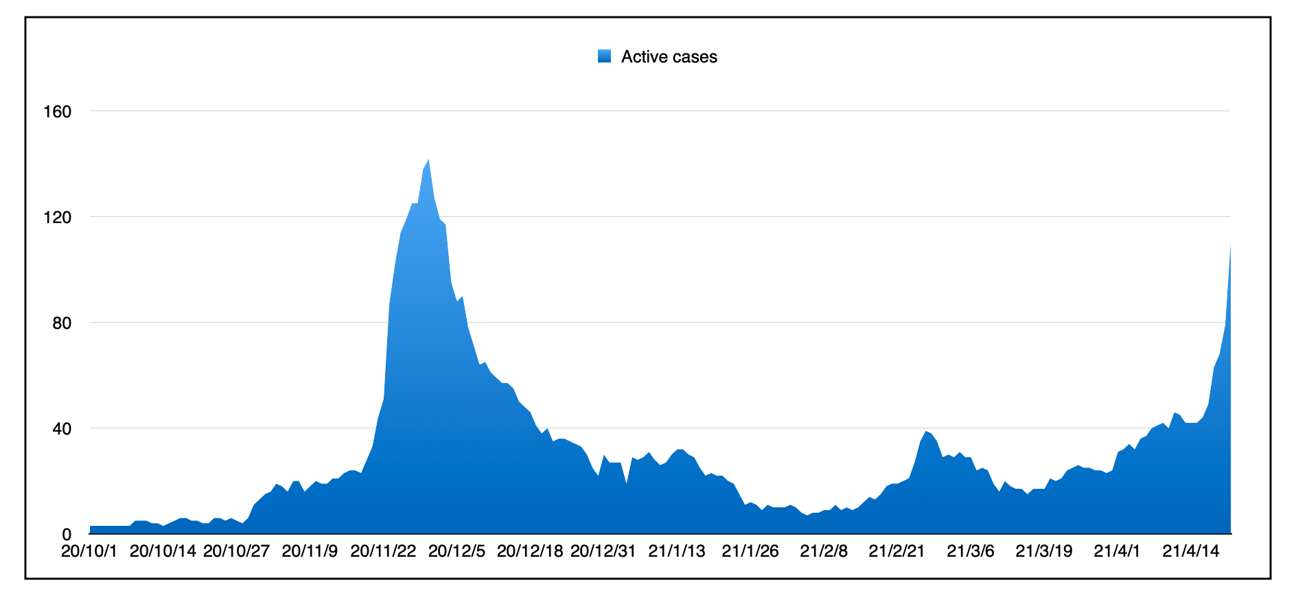 今天的一个病例被确定为B.1.1.7型,与旅行有关。到目前为止,已有66例B.1.1.7(英国)变种,12例B.1.351(南非)变种,1例P.1(巴西)变种。我将不再使用地理名称,因为它们不准确且不公平地描述整个国家。