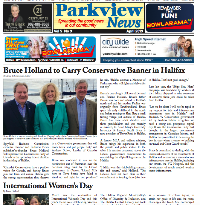 Andy de Champlain撰写的Andy de Champlain,4月份的第4月份问题的首页故事是“Bruce Holland,以哈利法克斯携带保守横幅”。因此,ParkView新闻的编辑是关于Parkview New's Bid的发布商和创始人的写作,成为ParkView新闻分发所涵盖的地区的MP。