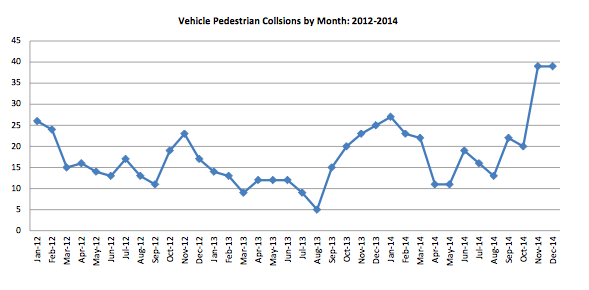 大多数行人相撞事故发生在人行横道上。45%的碰撞会导致罚单。去年,105名司机和16名行人被开罚单。