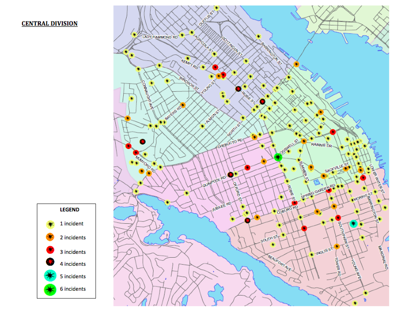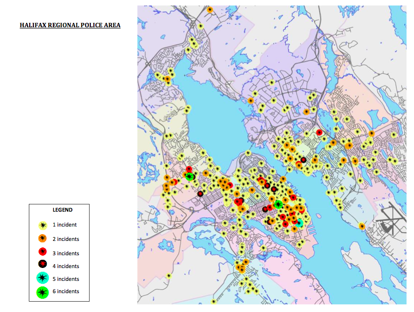 地图把他们分成两组,但哈利法克斯购物中心附近发生了七起事件。报告中写道:“在所有这些事件中,只有一次例外,行人都在人行横道上。”“四次事故中有三次发生在主楼附近,涉及学龄行人。”