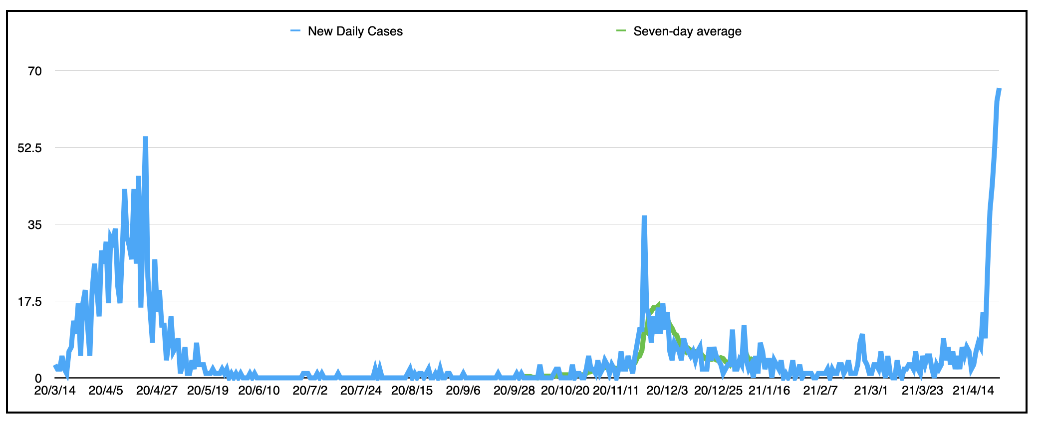 以下是2020年3月大流行开始以来每日新增病例数的图表: