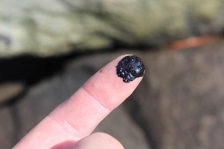 昨天,我去了Dartmouth Waterfront来看看石油。我在水中发现了一个油性光泽,沿着海岸线的岩石上的油状物: