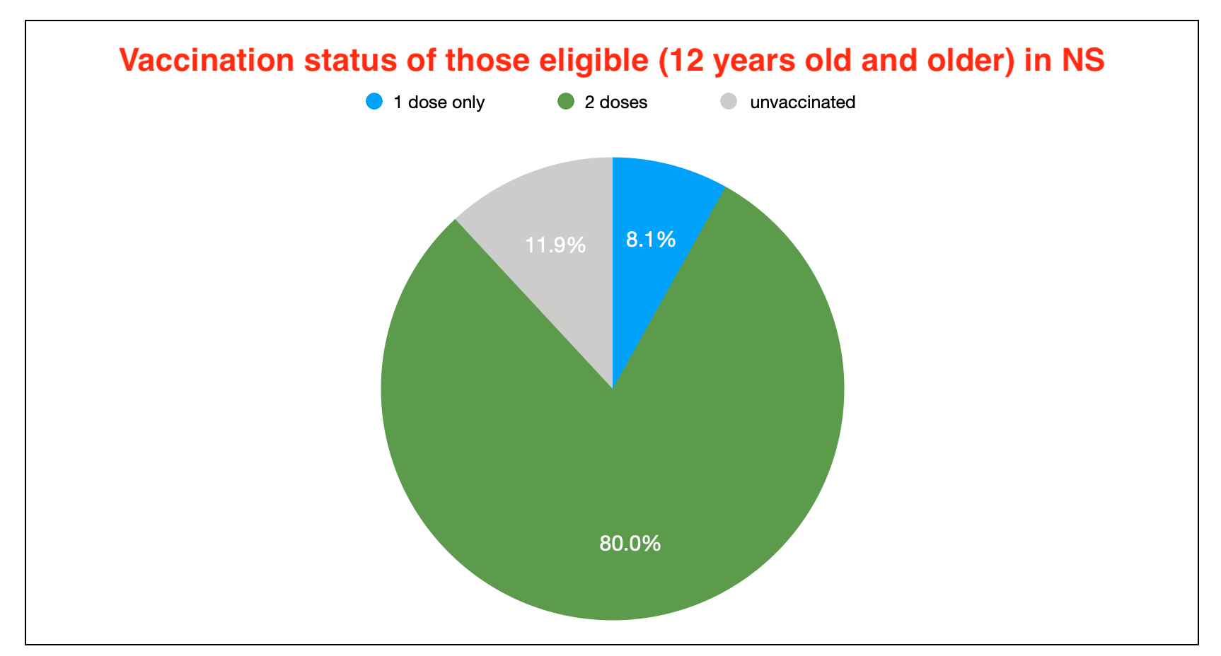 在符合接种条件的人群(12岁及以上)中,88.1%的人至少接种了一剂疫苗,80.0%的人接种了两剂疫苗。这是我的粗略估计,用的是我对人口年龄群的最佳估计。同样,如果我们把军事人员包括在内,双重剂量的比例在符合条件的人中上升到了惊人的84.0%。