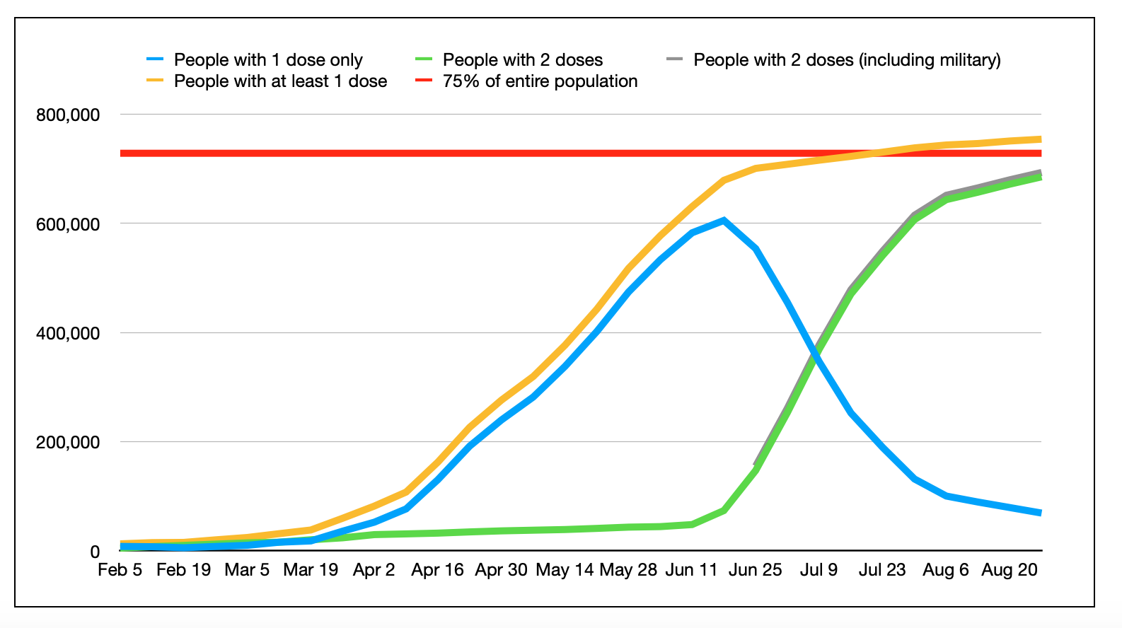 上面的图表显示了随时间疫苗接种的进展,正如周五捕获的那样。蓝线仅是一种剂量的人;绿线是有两种剂量的人(棕色线在有两剂的军事人员中增加);黄线是至少一种剂量的人,橙线占整个人口的75%。