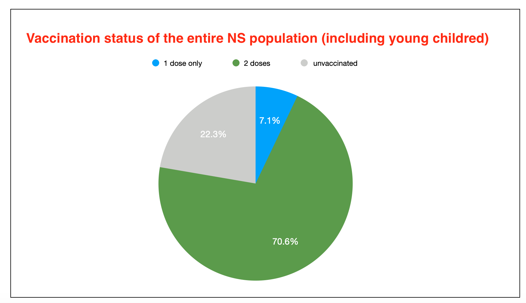 但是,驻扎在新斯科舍省的大约8 000名军事人员通过军事疫苗接种方案接种了疫苗,不包括在上述百分比中;如果包括他们,那么双重剂量的百分比将增加到整个人口的71.4%。