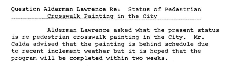 在周末,我花了“休息日”研究了一个项目,我正在努力,发现了1994年6月30日哈利法克斯市议会会议记录,关于城市船员迅速绘制人行横道的失败: