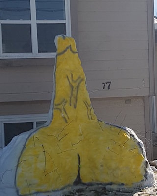 从失望中振作起来,我继续我的调查。我问道:“你会认为这个雕塑是对公众的亵渎吗?”自然,作为一名监狱权利活动家,我对雪阳具可能带来的法律后果很感兴趣。有人会因为在“下面”造雪而被起诉吗?