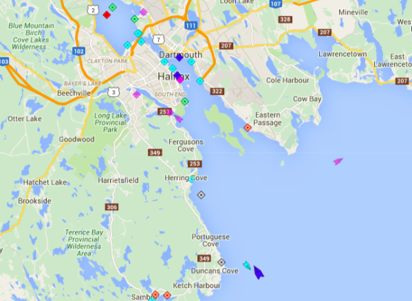 哈利法克斯港,周二上午9点。“切布托”号引航船(绿色)与“嘉年华阳光”号(蓝色)相遇,引航员可以引导游轮进入城镇,而不会触礁、沉没,让3,006名原本快乐的乘客陷入冰冷的水中死亡。地图:marinetraffic.com