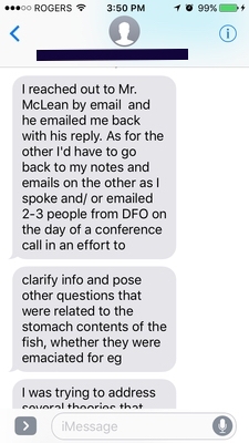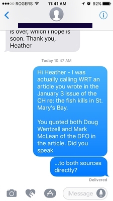上面这篇文章是由痂记者Heather Desveaux撰写的,是我最先挖掘的文章之一。我打电话给文中引用的两位渔业和海洋部工作人员。有趣的是,根据国土安全部媒体部门的通讯记录,在2016年10月6日到2017年1月2日,也就是这篇文章发表的前一天,国土安全部和德斯沃之间没有任何联系记录。我还和文章中引用的道格·温策尔(Doug Wentzell)谈过,他不记得自己是否为这篇报道与德斯沃谈过。