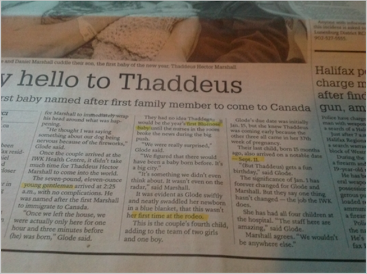这里有几个问题。首先,塞笛厄斯不是第一个“蓝鼻子婴儿”。作为本地快报正确的报告在加拿大,2017年在新斯科舍省出生的第一个婴儿于凌晨12点01分在肯特维尔出生。