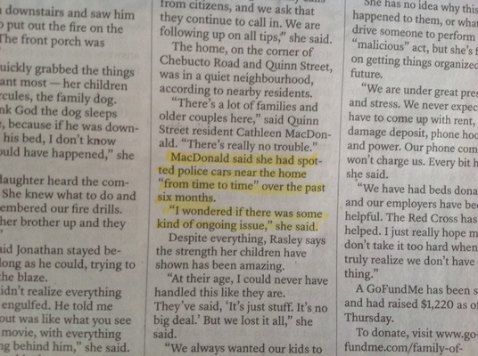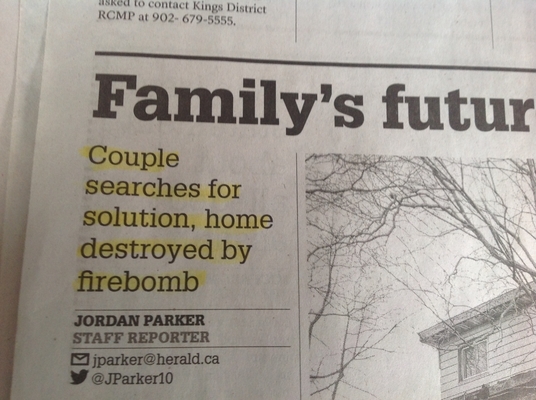 这是哈利法克斯西区一户人家遭到燃烧弹袭击的故事。除了突出显示的两句,整篇文章都集中在受影响家庭的困境上。坦率地说,我不明白为什么他们会被包括在内。警车附近家和警车不一样前面的家庭。也许警察在那里纯粹是出于预防的原因,也许他们在邻居家,又或许拉斯里一家在地下室开了个冰毒实验室。乔丹·帕克问家属了吗?他问过警察拉斯利家是否发生过意外吗?不知道,而且他也没有想到要给读者提供线索。