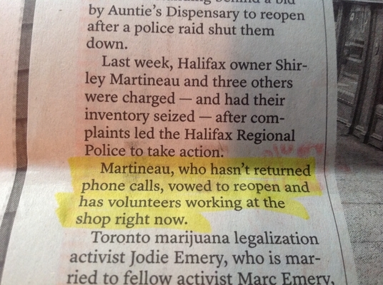 这个故事讲述的是巴林顿街的一家大麻药店,不管公众是否有医用大麻的处方,这家药店都向公众出售大麻。故事的重点是哈利法克斯警方关闭了这家药店。店主雪莉·马蒂诺(Shirley Martineau)没有回记者乔丹·帕克(Jordan Parker)的电话,但他知道她发誓要重新开业。他是怎么知道的?也许是"阿姨药房"在社交媒体上发的?也许他和店里的志愿者聊过?也许是朱迪·埃默里告诉他的?关键是他不知道从哪里得到的信息。你不能这么做,乔丹。