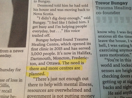 这是一个关于创伤后应激障碍(PTSD)退伍军人资源的背景故事,在上大特拉迪(Upper Big Tracadie)发生悲惨的谋杀-自杀事件几天后发表。同样,我们有一个陈述作为事实提供,但没有归因来支持它。有需求吗?大概吧,但这是因为创始人的说法吗?还是记者问过退伍军人事务部了?只要在句末写上“Bungay said”就可以解决这个问题。