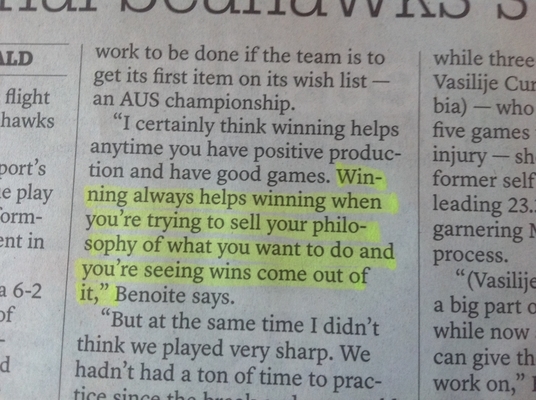 我相信胜利对胜利的帮助远远大于失败对胜利的帮助。说真的,回去看看你的录像。直接引用必须是逐字逐句的,除非教练在接受采访时中风了,否则我不认为他是这么说的。