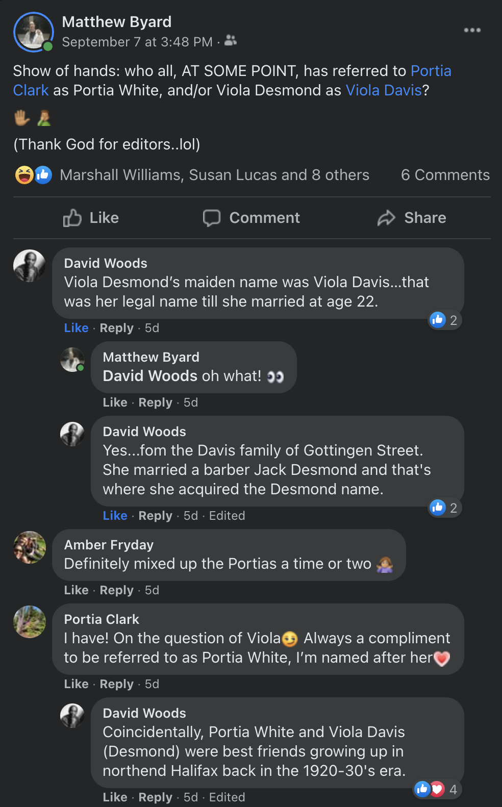 我记得两年前,在哈利法克斯北分馆图书馆举行的一次社区会议上,一位演讲者当着大约200人的面介绍克拉克担任小组主持人,当时她也犯了同样的错误,对此她优雅地笑了起来。我对自己说,这一定是一件很普遍的事情,所以我在一个私人社交媒体页面上问道:“请举手:谁在某个时候把波西亚·克拉克称为波西亚·怀特,或者把维奥拉·戴斯蒙德称为维奥拉·戴维斯?”——几年前,我曾向《观察家报》的一位作家指出,他们错误地把新斯科舍省已故的维奥拉·德斯蒙德(Viola Desmond)说成是美国演员维奥拉·戴维斯(Viola Davis)。然后大卫·伍兹和波西亚·克拉克自己发表了一些有趣的评论。见下文: