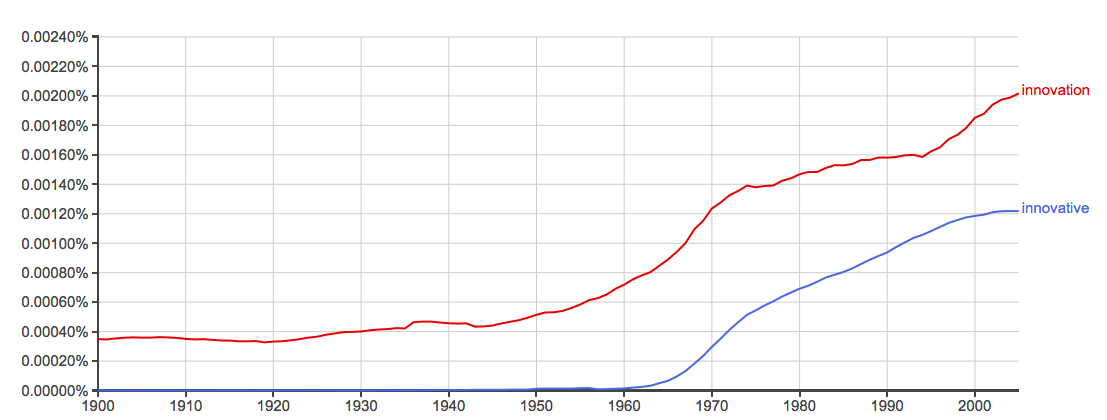 https://books.google.com/ngrams/graph?content=innovative%2Cinnovation&year_start=1900&year_end=2017&corpus=15&smoothing=3&share=&direct_url=t1%3B%2Cinnovative%3B%2Cc0%3B.t1%3B%2Cinnovation%3B%2Cc0