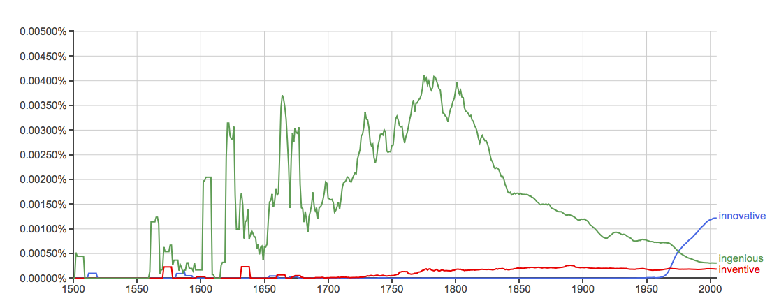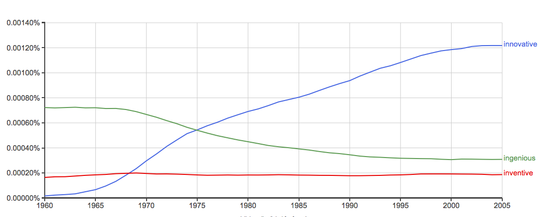 A look at synonyms over the past few decades is interesting. Since 1960, boring old “inventive” gets used at a steady rate, while “innovative” has in large part replaced (and more) “ingenious.” (Click here for full graph.)
