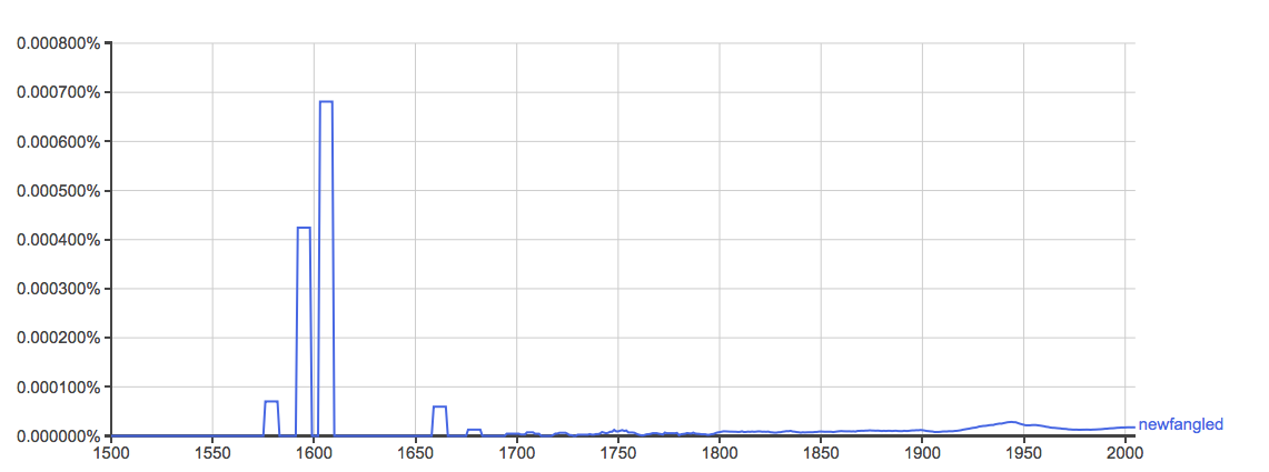 Alas, my preferred word, “newfangled,” doesn’t make much of an appearance except, weirdly, in the late 16th century. (Click here for full graph.)