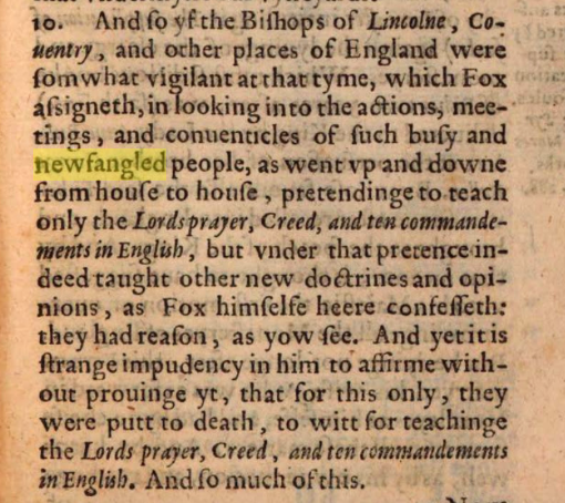 The second book was “An Examen of the Calendar or Catalogue of Protestant Saynts, Martyrs and Confessors,” which, if I have this right (I may not), was Robert Parsons’ review of John Fox’s original. Evidently the book was popular, and so this single reference puts “newfangled” on the map, or at least on the Ngraph: