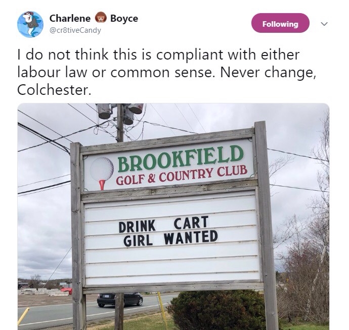 夏琳·博伊斯(Charlene Boyce)和托德·丹顿(Todd Denton)上周末在布鲁克菲尔德高尔夫乡村俱乐部(Brookfield Golf and Country Club)发现了这个标志。你可以在博伊斯的推特账号上关注讨论这里.