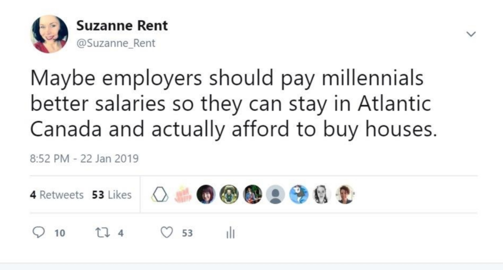 感激不能支付账单,但新斯科舍的雇主们利用了这种心态,以及我们这里的“生活质量”。不仅仅是雇主。你可以在那些抱怨雇主的文章的评论中看到——新斯科舍省的同事们抱怨说,现在的年轻人不再以每小时12美元的工资工作了。为什么他们?房租几乎翻了一番,育儿费用昂贵,许多人买不起房子。低工资意味着年轻人推迟了婴儿潮一代轻松度过的人生里程碑。