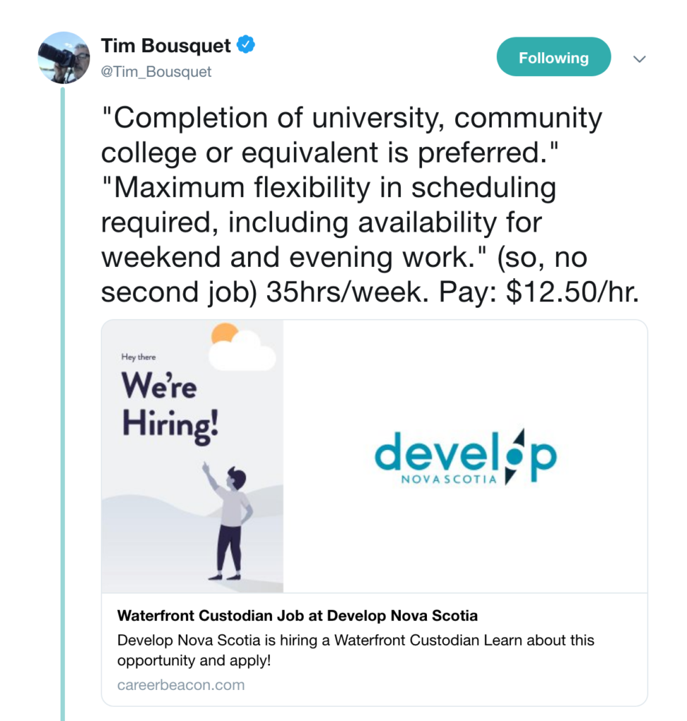 蒂姆已经在《主考人》写了很长时间关于生活工资的文章了。我也写过这里和这里,以及类似的政策基本收入并允许酒吧和餐厅员工保持他们的提示.这些政策将改善劳动人民的日常生活。这些都是评估他们对我们经济的贡献的方法。然而,当新斯科舍省的雇主抱怨缺少技术人才时,他们从不谈论工资问题。你从不谈论金钱的信念意味着我们现在在这里,没有挣到我们应得的。但问题远不止这些。