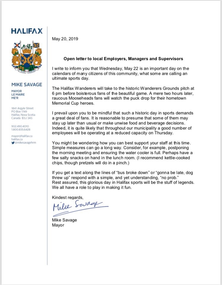 迈克·萨维奇(Mike Savage)周一给雇主、经理和主管们写了一封公开信,鼓励他们善待本周四可能“减产”的员工。这是这个故事加拿大广播公司。这是因为周三晚上,哈利法克斯有两场大型体育赛事:驼鹿头队(Mooseheads)将举行纪念杯(Memorial Cup)比赛;哈利法克斯流浪者会在下午6点来到流浪者园。