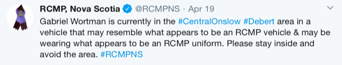 在周六晚上11点32分发布了关于Portapique地区“枪支投诉”的第一条推文后,RCMP直到第二天早上8点02分才发布了更多的公共信息,在一条推文中写道: