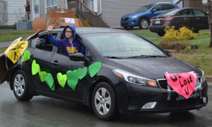 超过250辆汽车慢慢提交了一个在较低的萨克维尔的住宅街道。他们是鸣喇叭角,演奏乐观的音乐,呼喊良好的祝愿和问候到一个小小的微笑的男孩,坐在车道上的网眼帐篷里,他的父母在他的每一边。