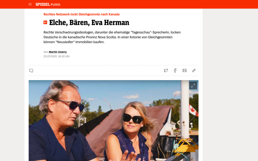 7月23日,2020年,德国最大的周刊《明镜周刊》发表了一份文章通过马丁Doerry《驼鹿,熊,伊娃·赫尔曼》:右翼理论家和阴谋论者,包括前《Tagesshau》节目主持人,将德国人吸引到加拿大新斯科舍省。‘新定居者’可以在志趣相投的人聚居的地方购买房地产。”