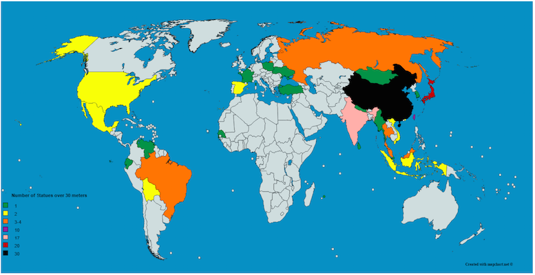 The best Reddit forum isMapPorn, and over the weekend posterbluemethenthusiastcreated a map of “Countries by number of statues over 30 metres,” as follows: