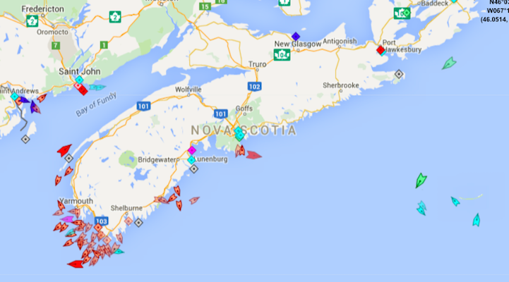 The seas around Nova Scotia, 8:45am Monday. The swarm of orange fishing boats on the southwest coast reveal that yesterday was the opening of lobster season. Map: marinetraffic.com