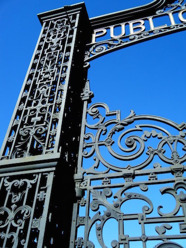 Stephen Archibald tracks down the history of thecast iron gates to the Public Gardens, noting that they were manufactured by the Macfarlane company in Glasgow, Scotland: