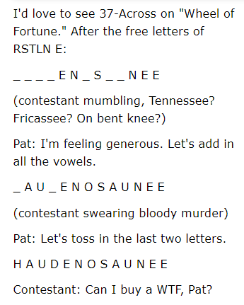 在3月28日,填字游戏博主杰夫陈抱怨关于埃克agard的纽约时报谜题 - 新的构造函数新的纵横填字游戏。具体来说,他对37次不满意:“iroquois联邦的原住民。”答案:“Haudenosaunee。”陈某想象如果这个词包含在财富的游戏轮上会发生什么。