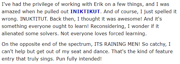 “我喜欢名字,我喜欢地方,我喜欢流行文化,音乐。我是一个忠实的粉丝。我宁愿看到它比“分子”或标准字。我喜欢自然语言和流行文化。我认为他们在谜题中是一个很好的包容性。“