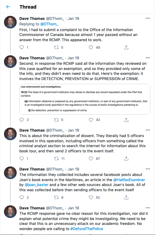 如果通过“获取信息”(Access to Information)发布的关于皇家骑警窥探库耶克在艾利森山大学(Mount Allison University)新书发布的报告是某种迹象的话,那么似乎皇家骑警也可能在“例行”监视和调查涉及作者和社区活动人士的事件——而且是在未经邀请或公众知情的情况下这么做的。