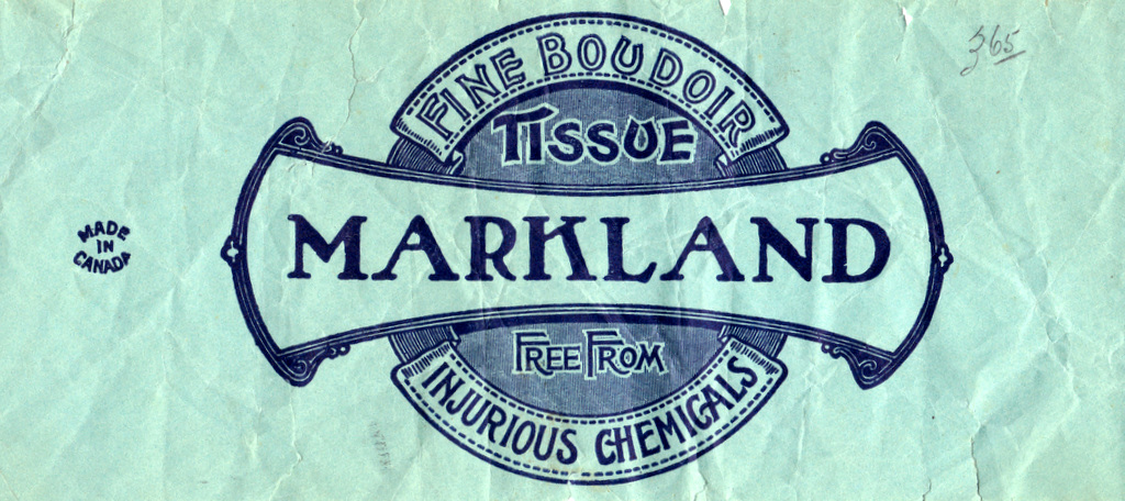 我在他们自己品牌的厕纸的包装纸上发现了这个商标。我见过的一款完整的包装纸是Markland Fine Boudoir Tissue的。雅茅斯一直梦想着早期的挪威人在那里定居,Markland是一个来自挪威传说的名字。它也是20世纪初雅茅斯港的一个大型旅游酒店的名字。