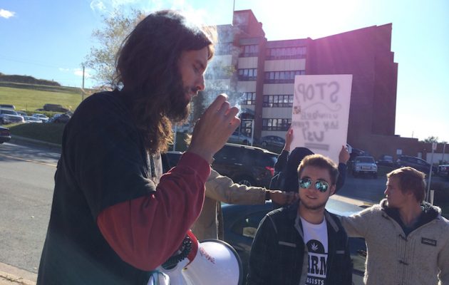 在这张2014年的照片中,克里斯·恩斯在哈利法克斯警察局的台阶上吸烟。照片:希拉里·博蒙特