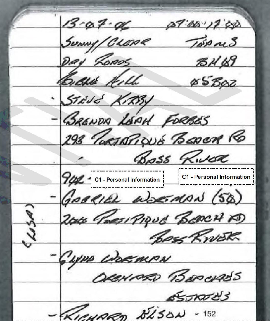 最后,皇家骑警发现了一页手写笔记来自于2013年7月6日接受福布斯报告的警官特洛伊·麦克斯韦尔。