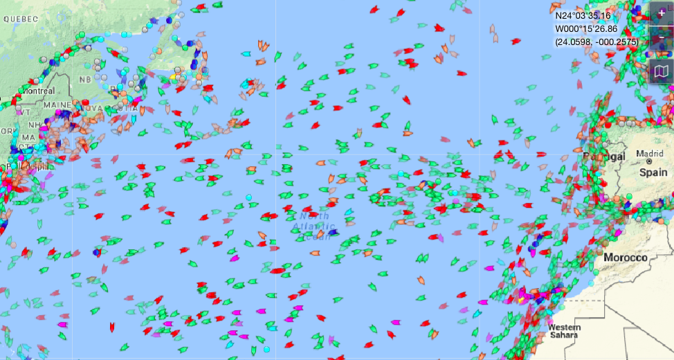 许多船只在北大西洋今天上午。地图:marinetraffic.com