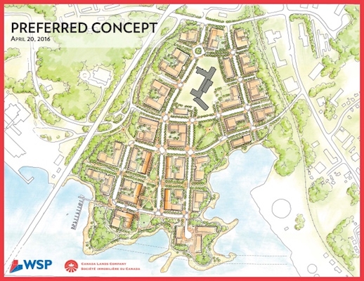 The long-awaited preferred concept for the redevelopment of the former Dartmouth military base, largely empty for 15 years, also includes waterfront access at several points, an urban centre, 17 acres of green space and an extensive trail and cycling system, according to plans presented by Greg Zwicker, vice-president of WSP Canada Inc. and Chris Millier, director of real estate for Canada Lands Company, which owns the 39-hectare property.
