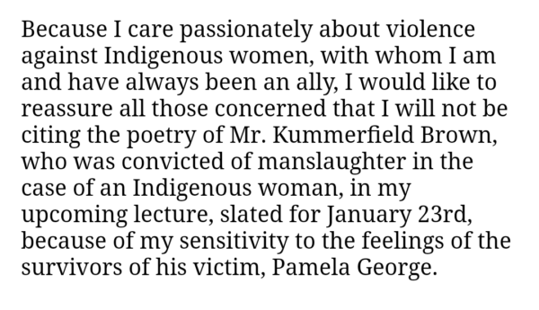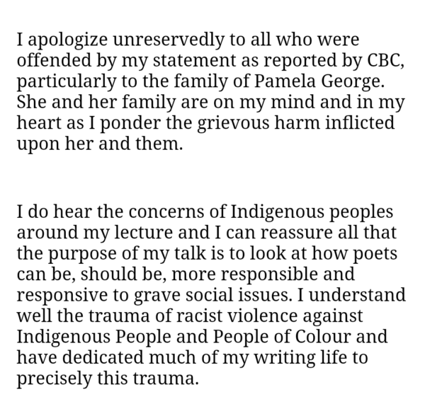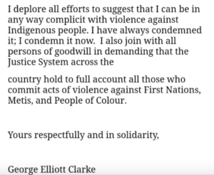 Renowned poet George Elliott Clarke is at the centre of a controversy based out of the University of Regina in Saskatchewan, where he was slated to give the Woodrow Lloyd annual lecture, which he had titled, “‘Truth and Reconciliation’ versus ‘the Murdered and Missing’: Examining Indigenous Experiences of (In)Justice in Four Saskatchewan Poets.” The poet is a longtime friend and editor of Steven Kummerfield, the convicted murderer of Pamela George, an Indigenous woman and mother. After concerns were raised about his relationship with Kummerfield,克拉克告诉CBC记者邦妮·艾伦他尚未编写他的讲座或选择要讨论的四个诗人,并且他“可能会或可能不会”在讲座期间被Kummerfield读取的东西。他后来为这场评论道歉,并承诺不读到任何Kummerfield的工作。这是克拉克的声明,如引用记者Radheyan Simonpillai在推特上写道:
