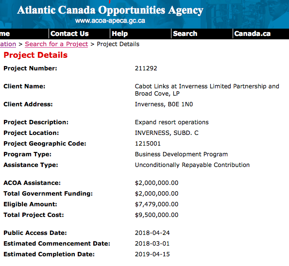 Cabot Links从大西洋加拿大机会局(ACOA)获得了200万美元的贷款,用于“扩大度假村业务”。