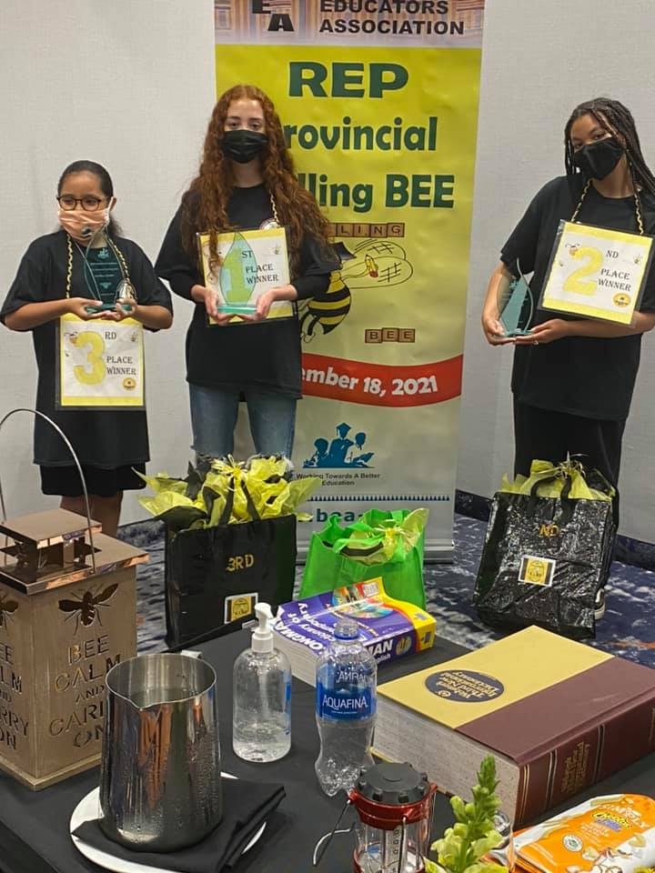 第三名莉莉·桑切斯,第一名Mya Gloade,第二名Jenaya Pictou在2021年BEA拼字大赛上。照片:Jenaya Pictou。